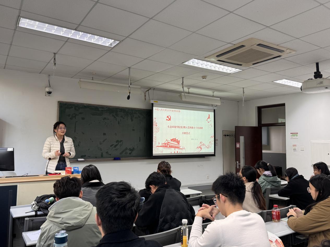11月13日下午,生态环境公司党校第2期积极分子培训班组织学员开展了第二次集中学习。公司专任教师党支部书记、生态与环境经济学系主任马本副教授以《习近平生态文明思想引领人与自然和谐共生的中国式现代化》为题,围绕人与自然和谐共生的现代化和习近平生态文明思想引领两大方面带领学员们进行了系统学习。接着,学员们以“结合党的二十大精神和党的二十届三中全会精神,以当代人大环境青年学子如何践行习近平生态文明思想”为主题进行小组展示与讨论。