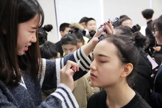 12月10日上午8点,环境学子准时齐聚明德主楼0304,为下午的比赛进行最后的准备。身着演出服,男生们西装革履风度彬彬,女生们一袭金色长裙,仿佛有日月星河在身上流光溢彩。化妆工作有条不紊地进行着。小山重叠金明灭,鬓云欲度香腮雪。一切准备就绪的队员们神采飞扬。