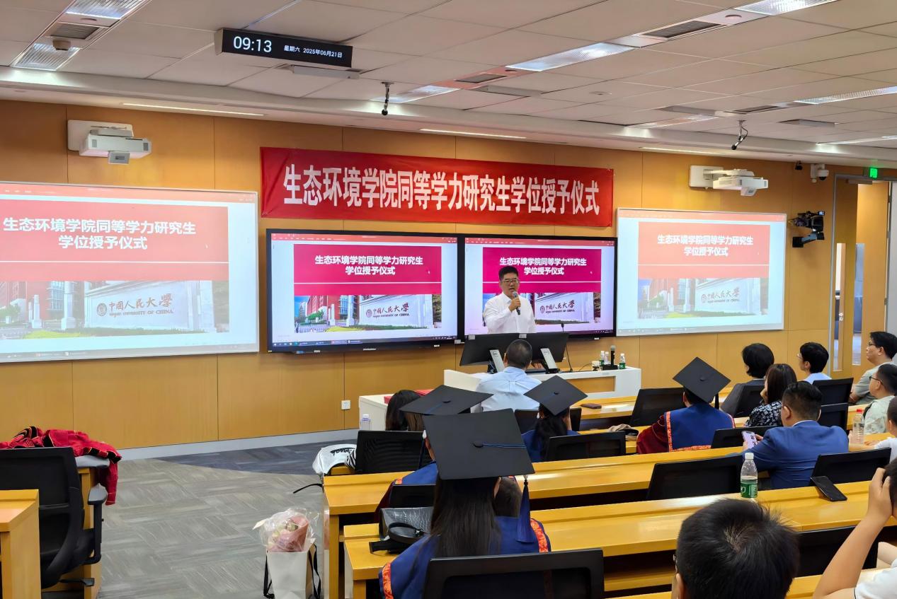 毕业生代表宋思达分享了自己求学之路的感悟。他回顾了入学以来自己克服专业基础薄弱、工作繁忙等困难,利用一切时间学习备考,顺利通过国家考试,并最终获得硕士学位的历程。他向悉心指导自己学位论文的公司老师们表示崇高的敬意和衷心的感谢:“每一处论文批注都是最珍贵的财富。”最后,宋思达引用王安石的诗句“不畏浮云遮望眼,自缘身在最高层”,表达了对学术攀登的坚定信念,并呼吁同学们以所学知识服务可持续发展,做“绿色追梦人”。