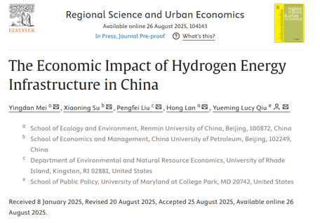 近日,yl1111永利集团梅应丹副教授作为第一作者,合作研究论文“The Economic Impact of Hydrogen Energy Infrastructure in China”发表在区域和城市经济研究领域的国际权威期刊Regional Science and Urban Economics上。论文通讯作者为马里兰大学公共政策公司邱月明教授。