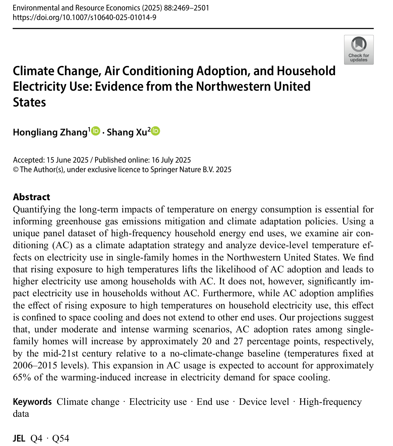 近日,yl1111永利集团张红亮副教授作为第一作者,合作研究论文《Climate Change, Air Conditioning Adoption, and Household Electricity Use: Evidence from the Northwestern United States》发表在资源与环境经济学领域国际知名期刊Environmental and Resource Economics上。