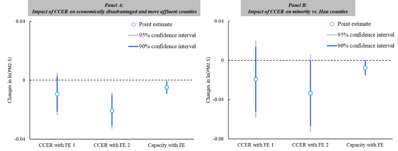 该研究基于县级面板数据,构建CSDID模型和三重差分模型评估了中国核证自愿减排量(CCER)对空气污染与环境公正的影响。结果显示,CCER建设使县级二氧化碳排放下降2.89%、PM₂.₅浓度下降2.13%;同时,CCER建设能够使经济不发达县与少数民族县的PM₂.₅浓度分别额外下降2.05%与3.34%。进一步分析显示,可再生能源类项目带来的改善效果更为显著,而绿色投资与绿色创新水平是其发挥作用的主要机制。