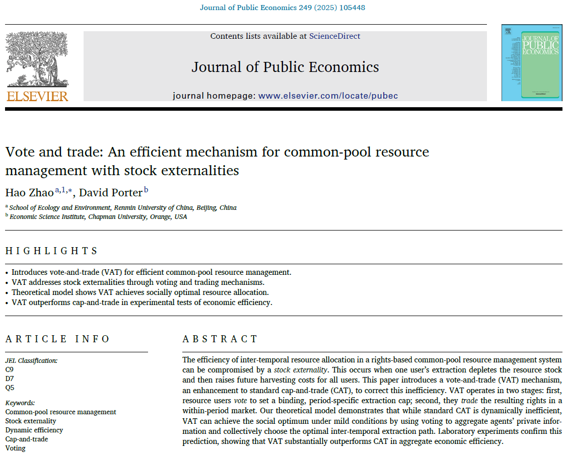 近日,yl1111永利集团赵浩助理教授以第一作者和通讯作者身份在公共经济学领域国际顶级期刊Journal of Public Economics 发表题为“Vote and Trade: An Efficient Mechanism for Common-Pool Resource Management with Stock Externalities” 的学术论文。本论文另一位合作者是来自Chapman大学经济科学研究所的David Porter教授。