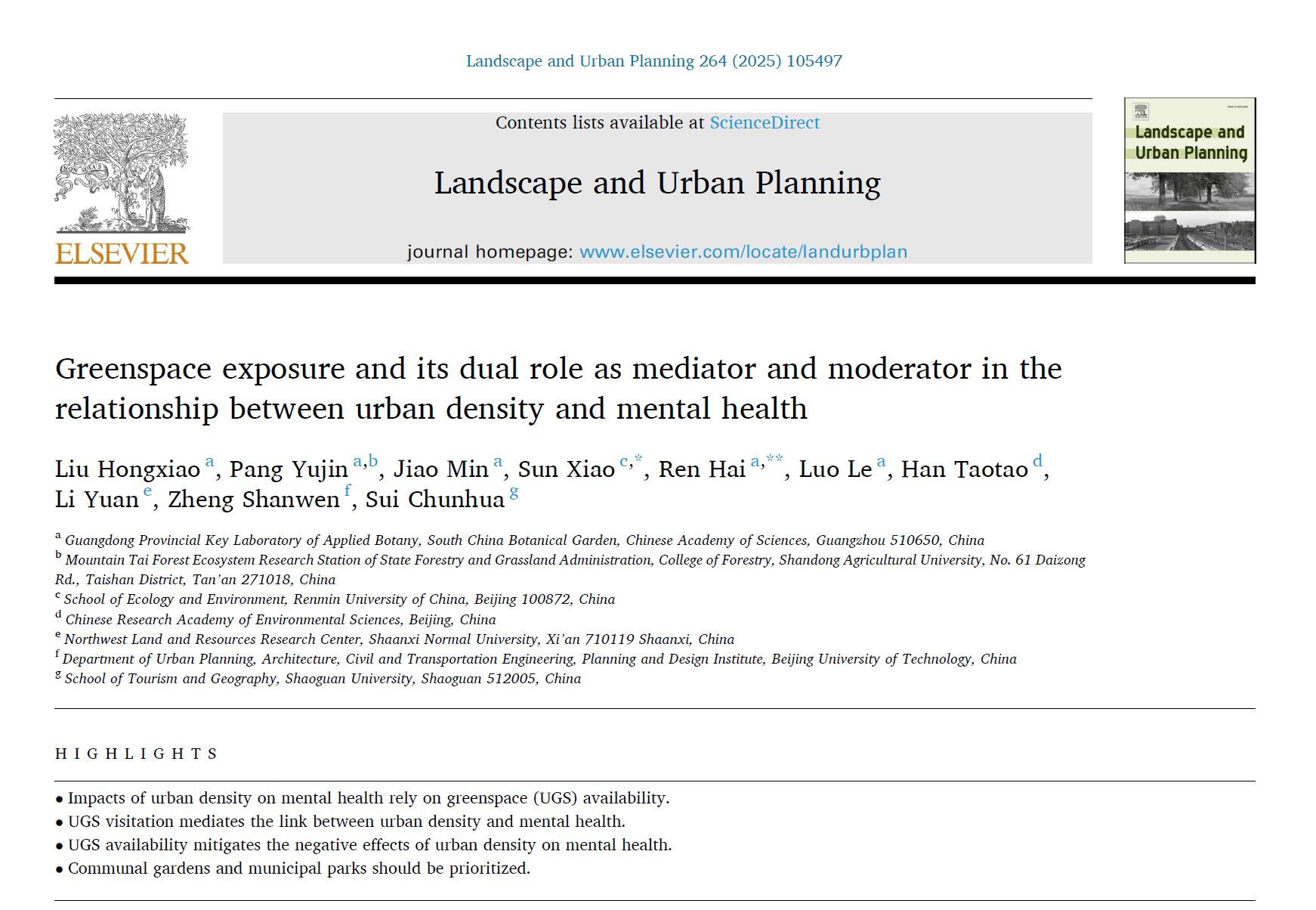 近日,yl1111永利集团孙晓副教授作为通讯作者,与合作者的研究论文“Greenspace exposure and its dual role as mediator and moderator in the relationship between urban density and mental health”在景观生态学及城市规划领域国际顶级期刊Landscape and Urban Planning发表。