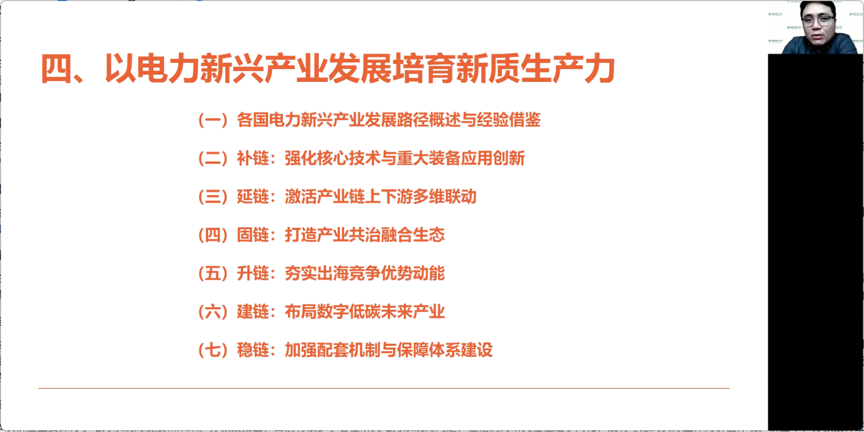 最后,孙传旺教授基于其他国家和地区电力行业的发展经验,阐释了以电力新兴产业发展培育新质生产力的几个关键方面。他指出,要打造整个电力产业的共治融合生态,包括创业链、产业链、资金链、人才链以及行业联盟等。同时,要推动合作对象的多元化,尤其是“一带一路”沿线国家。此外,还要提高企业国际化经营能力,应对风险,满足电力产品的多元化、个性化需求。最后,要建立数字化布局,引导低碳转型,强化数字产业牵引,推动数字化赋能,打造数字加能源的战略新兴产业。