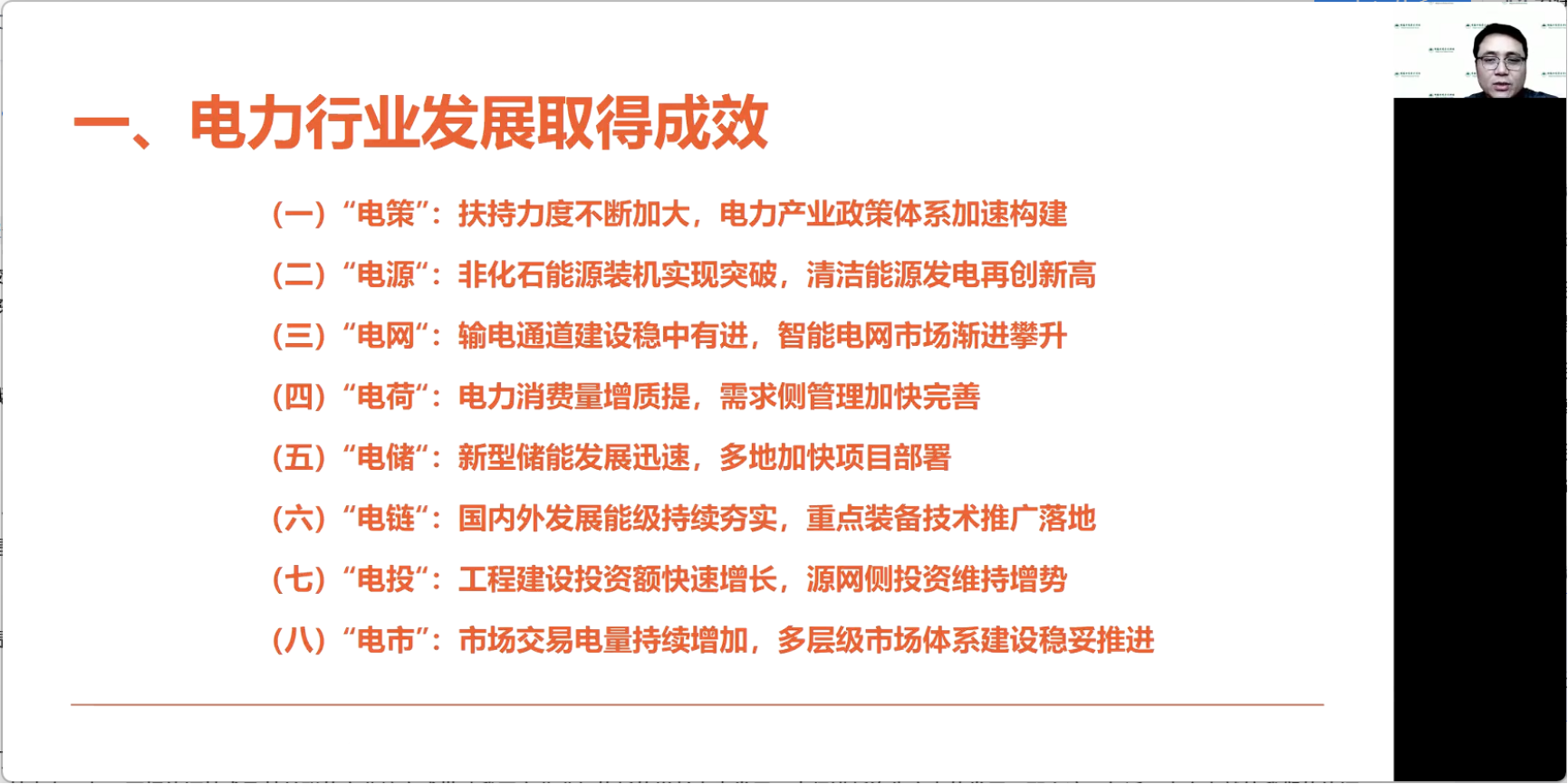 首先,孙传旺教授指出,围绕能源高质量发展、数字化、智能化发展、构建新型电力系统等方面,中国电力产业政策体系正在加速构建。基于此,孙传旺教授指出电力行业在以下方面的发展取得显著成效:一是“电源”的规模扩张,实现了非化石能源装机突破,清洁能源发电再创新高;二是“电网”的建设成效,表现为输电通道建设稳中有进,智能电网市场渐进攀升;三是“电荷”的消费提升,电力消费量增质提,需求侧管理加快完善;四是“电储”的迅速发展,体现为新型储能发展迅速,多地加快项目部署;五是“电链”的升级发展,表现为国内外发展能级持续夯实,重点装备技术推广落地;六是“电投”的高额增长,具体为工程建设投资额快速增长,源网侧投资维持增势;七是“电市”的消费升级,表现为市场交易电量持续增加,多层级市场体系建设稳妥推进。