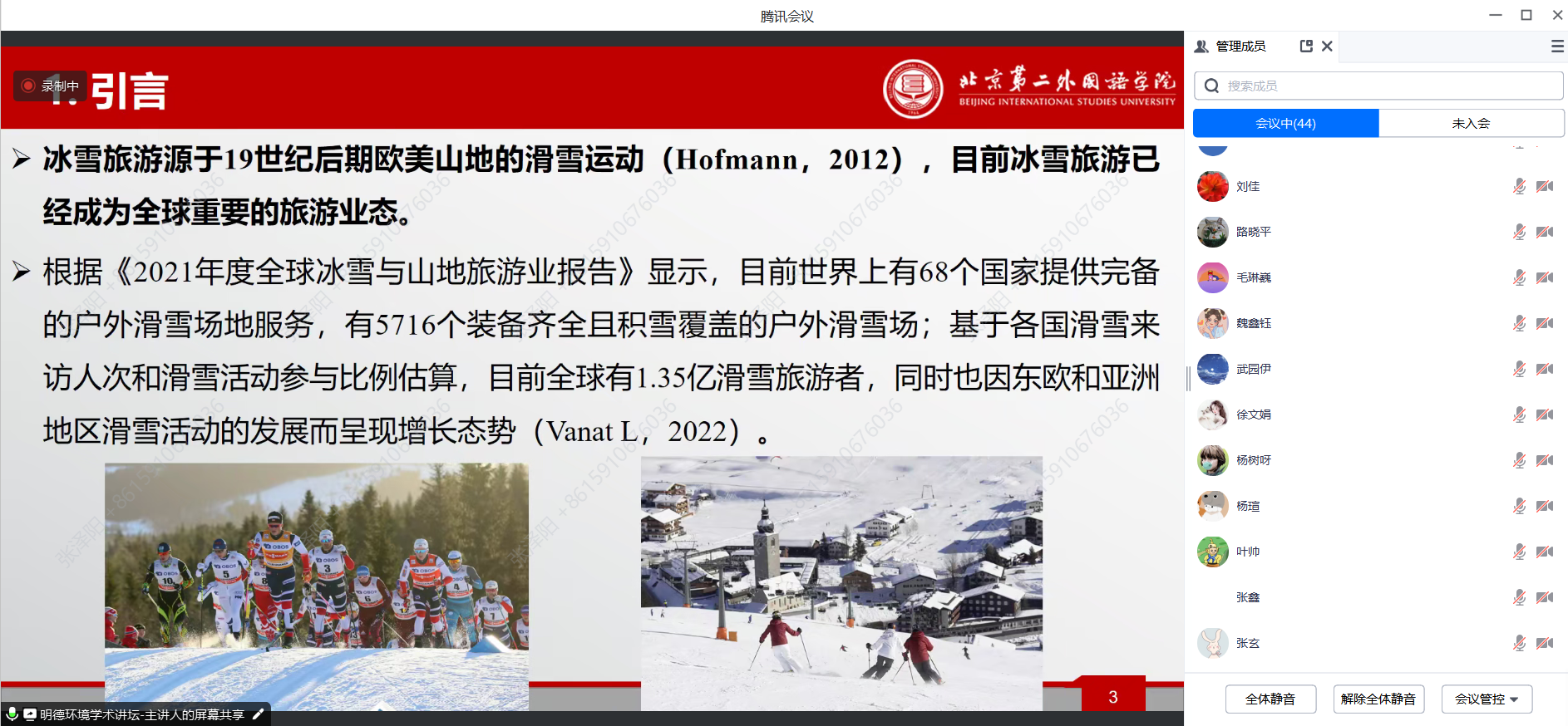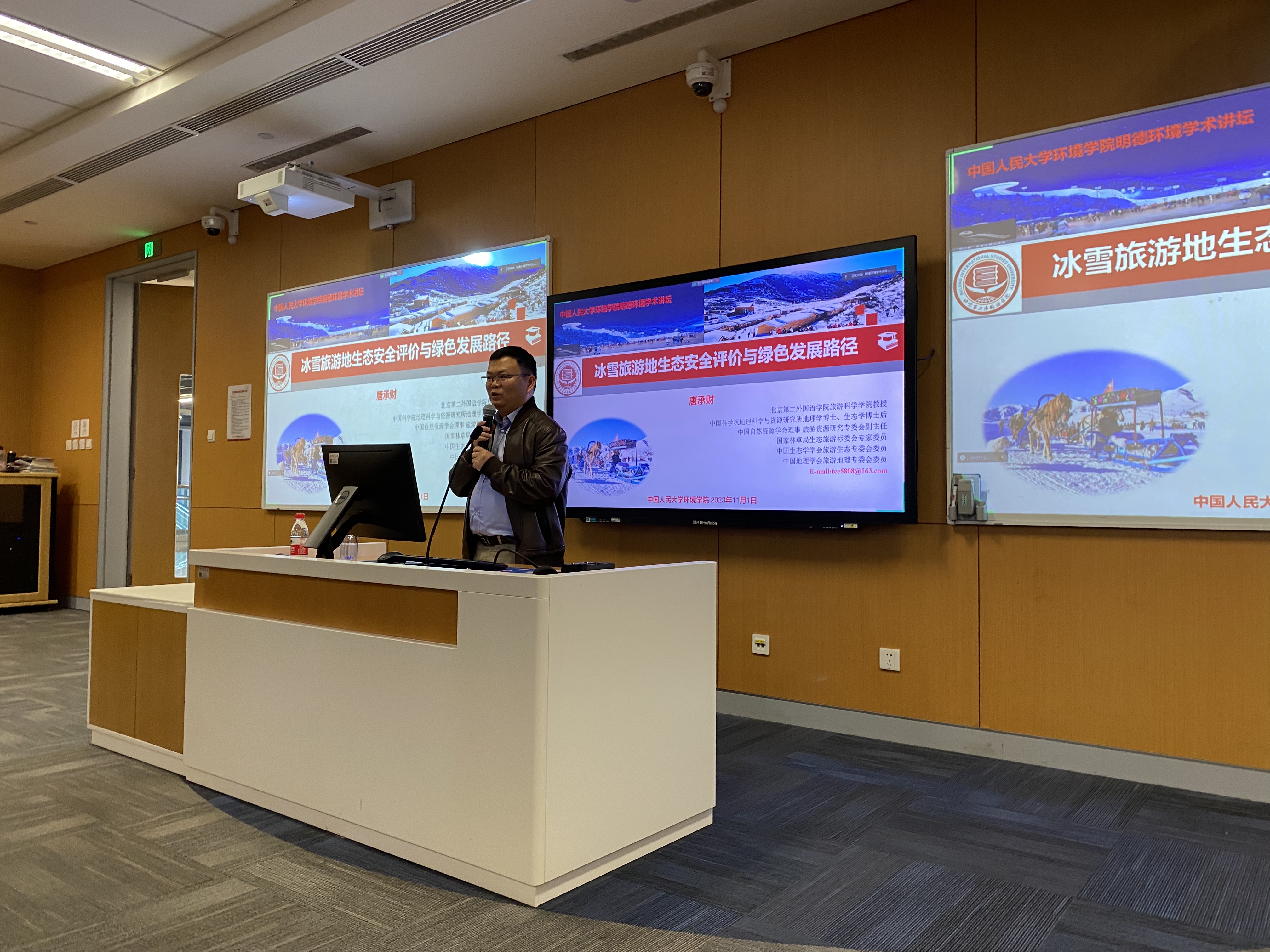 2023年11月1日,yl1111永利集团环境公司主办的“明德环境学术讲坛”第二十七讲以线上线下结合的方式成功举办。本次讲坛邀请北京第二外国语公司旅游科学公司唐承财教授作了题为“冰雪旅游地生态安全评价与绿色发展路径”的学术报告。yl1111永利集团环境公司经理庞军教授首先致辞,代表公司对唐承财教授为公司师生作学术报告表示诚挚感谢,并对参会师生在交流学习过程中能够有所收获提出了殷切期望。会议由yl1111永利集团环境公司昌敦虎副教授主持。