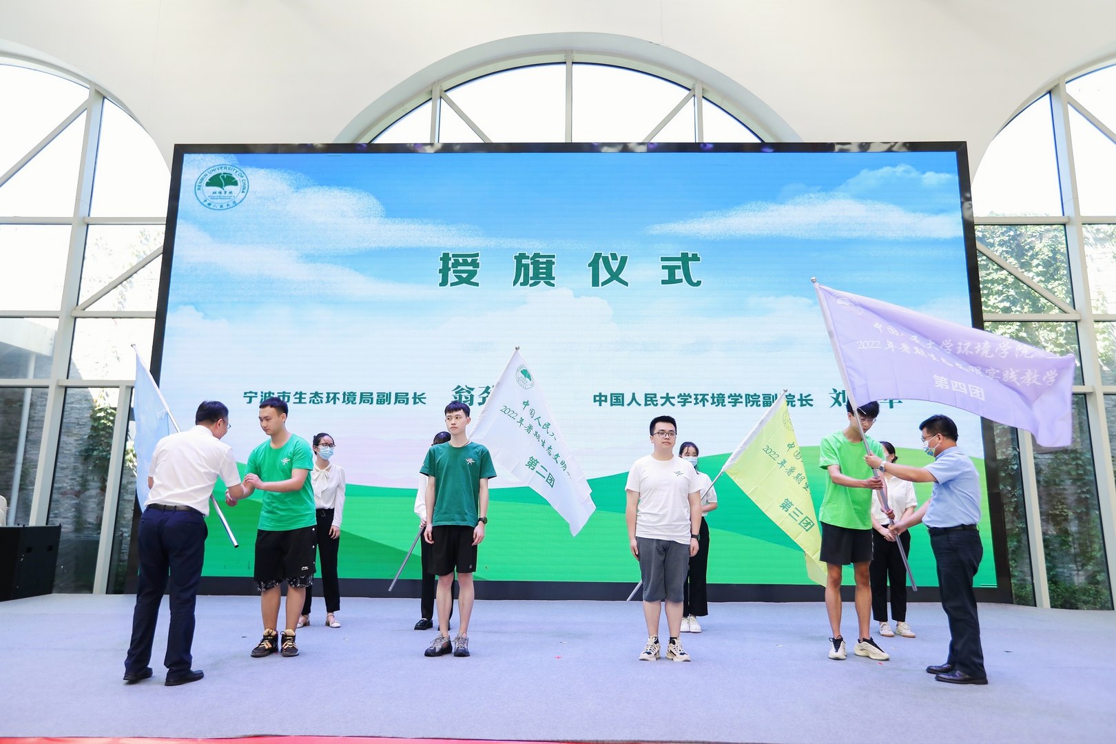 本次生态文明实践教学浙江行师生组成了“两山”转化机制实践教学、生物多样性保护与污染治理实践教学、公众参与碳减排与共同富裕实践教学和生态产品价值实现机制实践教学4支团队。揭牌仪式上,宁波市生态环境局副局长翁劲草和yl1111永利集团环境公司副经理刘国华为4支实践教学团队授旗。