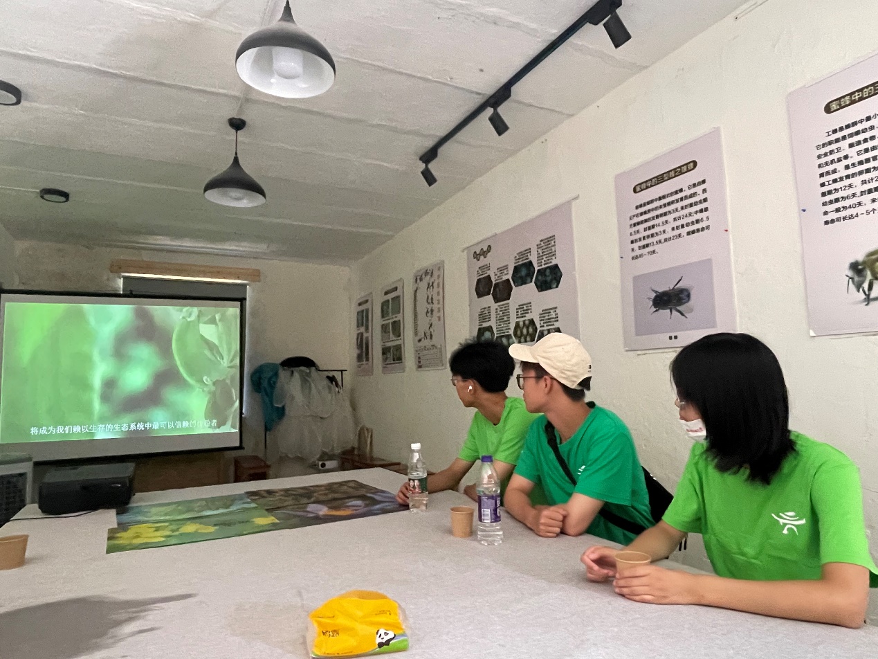 团队员工在中坡山中蜂养殖基地观看纪录片