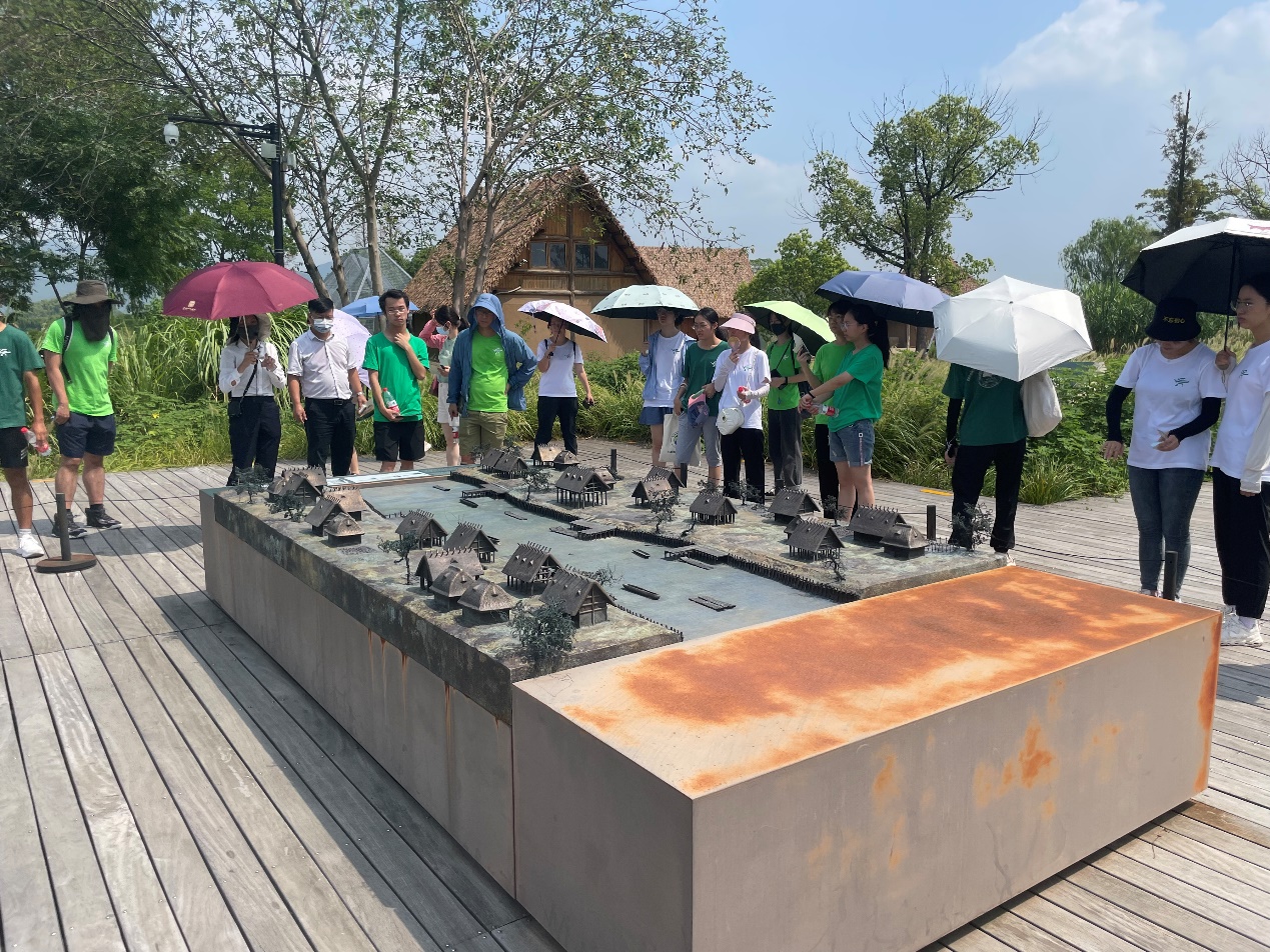 实践团队依次参观了河道作坊遗址、反山王陵墓地等古城遗迹。据了解,良渚古城遗址公园在2020年创新实施了生态立体修复工程,对园区进行了系统的“山水林田湖草综合整治生态修复”,实现了文物保护与水生态环境改善的双赢。此外,良渚古城外围水利系统,是迄今所知中国最早的大型水利工程,也是世界最早的水坝。师生在考察中从历史的角度思考人与自然、人与环境的关系,站在漫长的时间维度上回顾自然环境的变迁。
