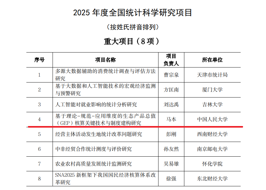 近日,国家统计局公布了2025年度全国统计科学研究项目立项名单,公司马本副教授申报的课题“基于理论-规范-应用维度的生态产品总值(GEP)核算关键技术与制度建构研究”获得重大项目立项资助。