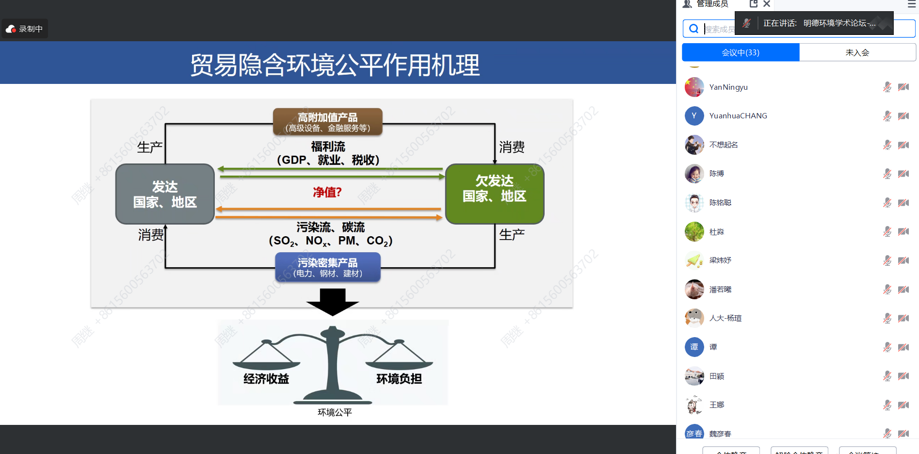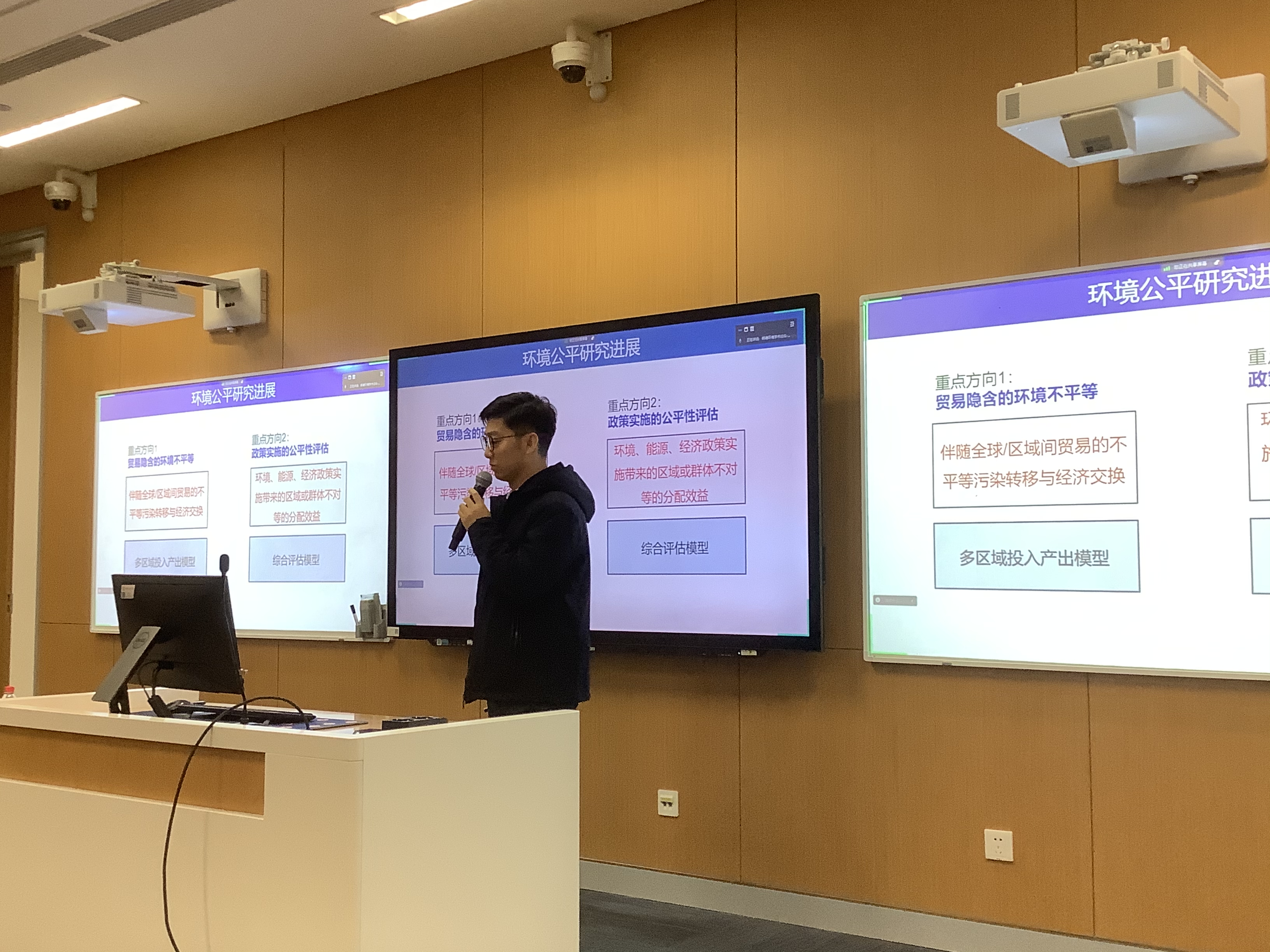 在交流讨论环节,来自线上线下的多位高校师生针对学术报告中关于代际环境公平研究范式、全球发展中国家不平等程度测度、省际排污权交易公平性指标选取、减碳降污的公平性协同效应、环境管理部门与其他管理部门的协作机制等问题,与张伟研究员进行了深入探讨,气氛活跃,师生反响热烈。