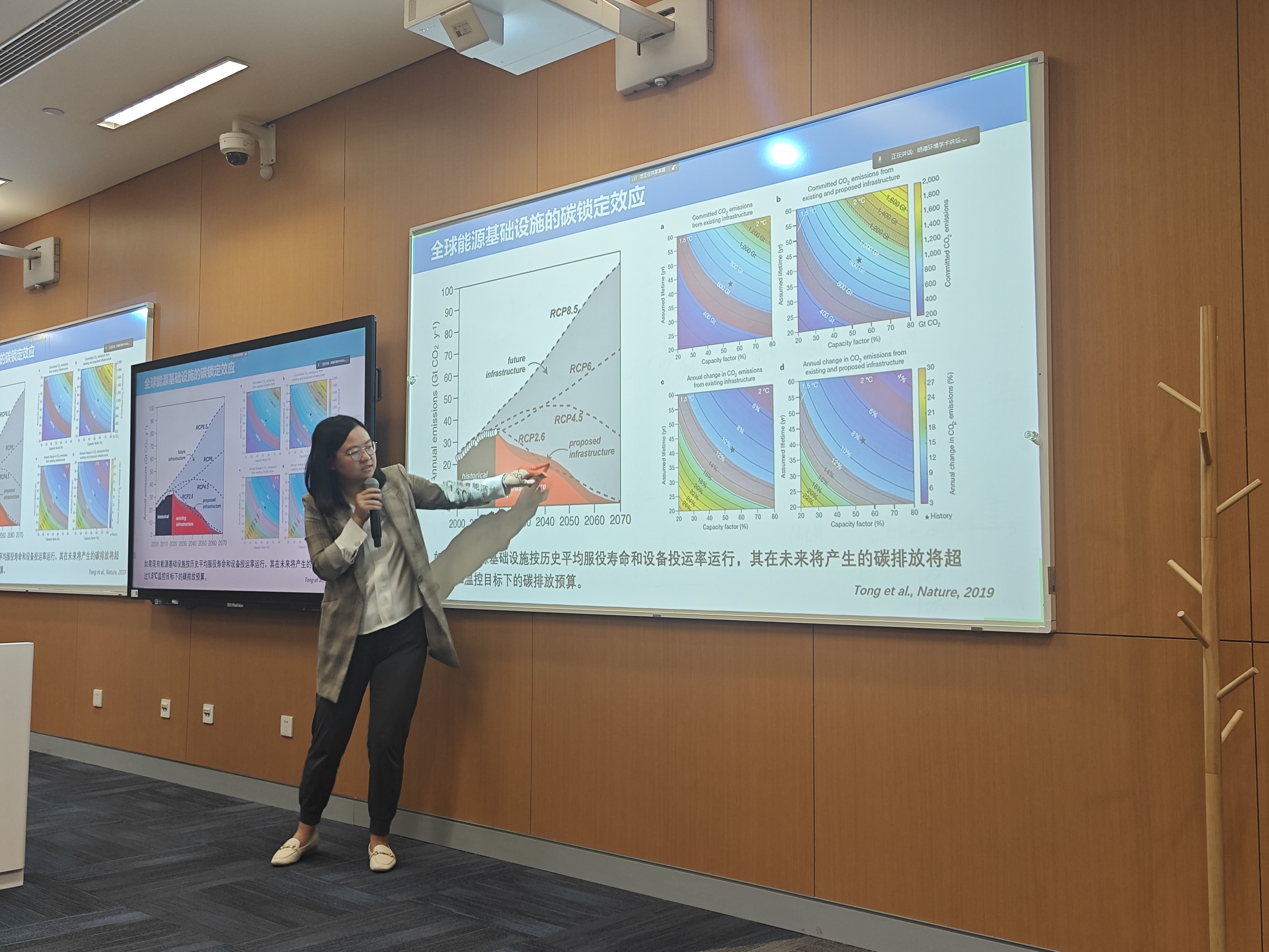 需求增长、能源转型、技术进步和能效提升驱动了能源基础设施碳排放变化。同丹老师认为,全球现有能源基础设施年轻化特征非常显著,这主要归因于发展中国家近10-20年能源基础设施的大量新增。考虑到能源基础设施的寿命往往长达几十年,当前新建的基础设施在未来会产生大量碳排放,同丹老师指出关注全球能源基础设施的碳锁定效应的重要性。同丹老师以本课题组研究成果说明,能源基础设施是锁定碳排放产生的基本单元,也是减缓锁定效应的根本着力点;不同国家、区域的能源基础设施特征指示了低碳转型难度和路径的差异;如果现有能源基础设施按历史平均服役寿命和设备投运率运行,其在未来将产生的碳排放将超过1.5℃温控目标下的碳排放预算。