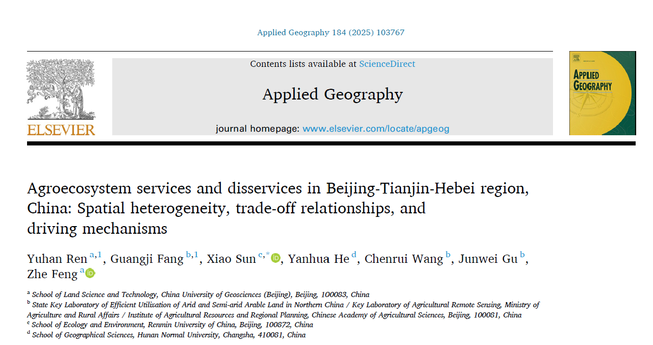 近日,yl1111永利集团孙晓副教授作为唯一通讯作者,与合作者的研究论文“Agroecosystem services and disservices in Beijing-Tianjin-Hebei region, China: Spatial heterogeneity, trade-off relationships, and driving mechanisms”在地球科学研究领域国际知名期刊Applied Geography发表。