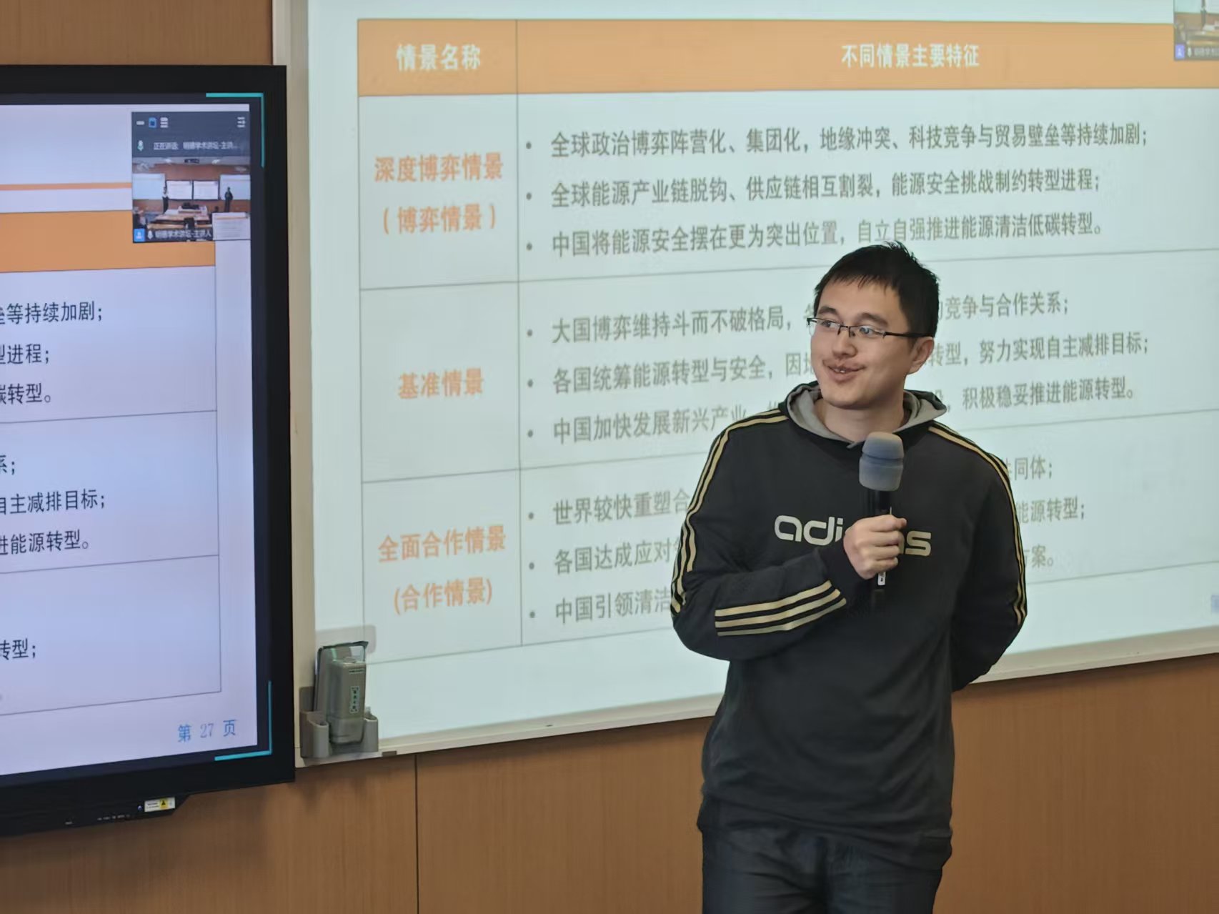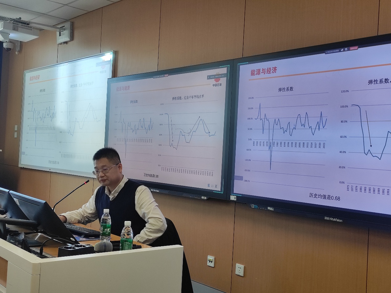 王利宁研究员首先介绍了中国石油集团经济技术研究院的发展历程和研究布局,并引出本次报告的核心问题:在“碳达峰、碳中和”目标约束下,如何从中国与世界两个尺度研判未来能源发展的总体趋势和不确定性。围绕这一主题,王利宁研究员从能源在社会经济发展中的多重角色展开分析,通过人均GDP与人均能耗的历史演变、人均能耗平台期、雾霾治理等典型数据,形象说明不同发展阶段能源消费水平的变化特征及其对减排路径的制约,强调要在统筹发展与安全的前提下推进能源清洁低碳转型。