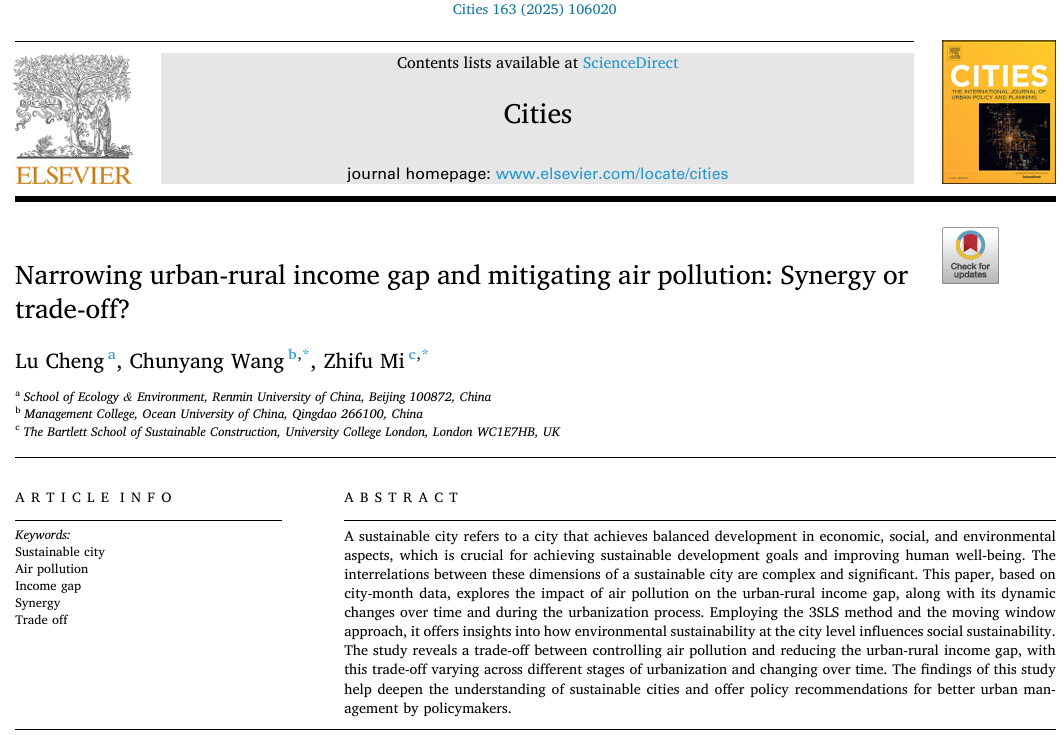 近日,yl1111永利集团成璐助理教授作为第一作者的研究论文Narrowing urban-rural income gap and mitigating air pollution: Synergy or trade-off? 发表在城市研究领域权威期刊Cities上。