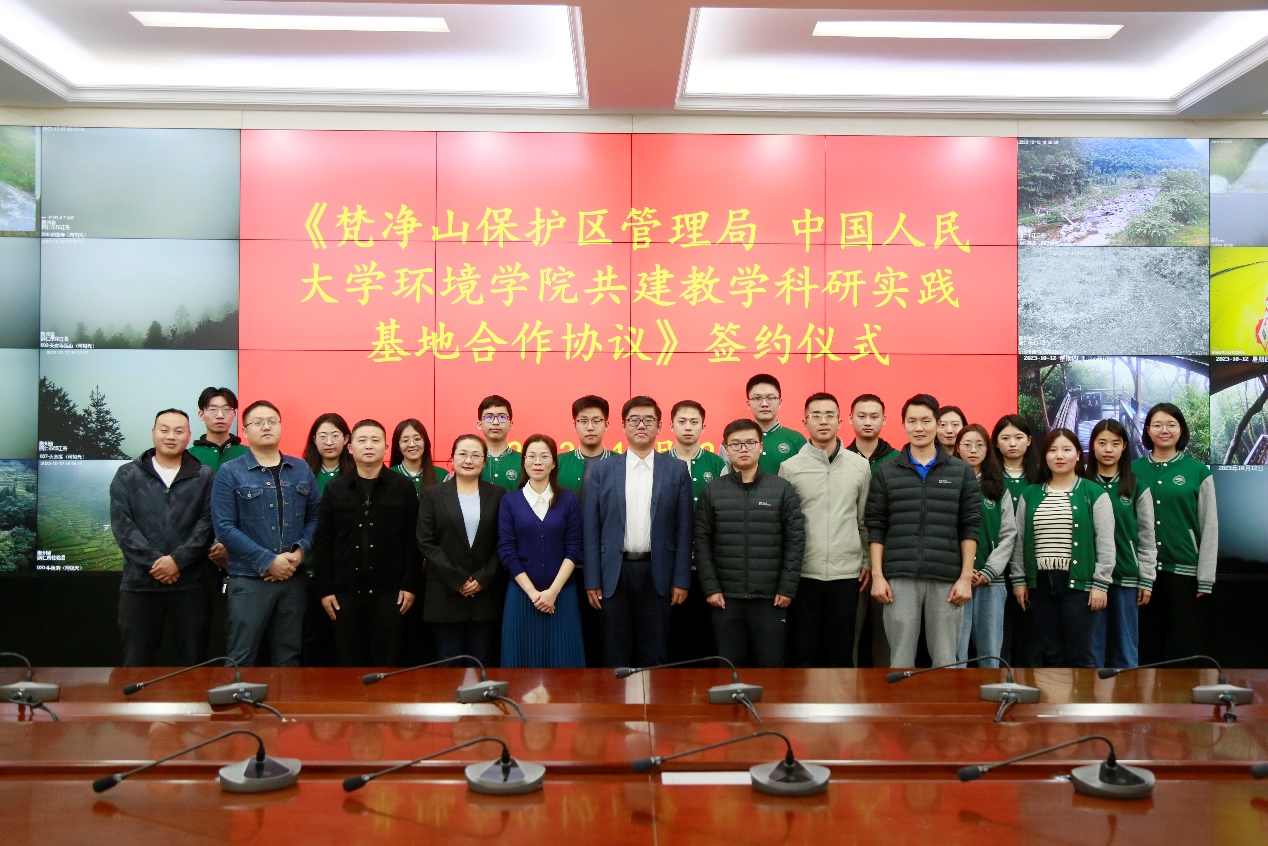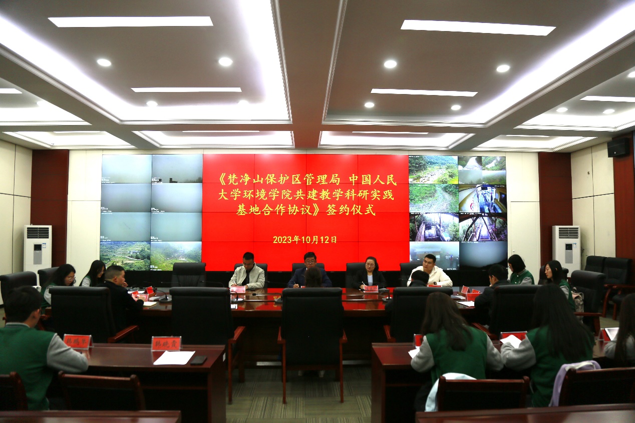 最后,调研团队与梵净山管理局领导在梵净山管控平台开展了“梵净山保护区管理局 yl1111永利集团环境公司共建教学科研实践基地合作协议”签约座谈会。yl1111永利集团环境公司党委书记贾铁英老师和梵净山管理局杨妮副局长代表双方签订了合作协议,双方在生态文明建设领域的教学实践、人才培养与科研交流等方面达成战略合作。调研团队师生和梵净山管理局工作人员关于梵净山自然保护区的保护现状、管理体系、规章制度、生态旅游、社区工作、科研工作等多方面内容进行了交流讨论。