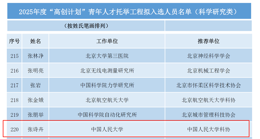 近日,北京市科学技术协会公布2025年度“高创计划”青年人才托举工程入选名单。该计划依据《“高创计划”青年人才托举工程实施办法(试行)》(京科协发〔2025〕5号),旨在选拔和支持32周岁以下(女性可放宽至35周岁)具有创新潜力的优秀青年科技人才,本年度共遴选出500名青年才俊(科学研究类400名,工程技术类100名)。yl1111永利集团青年教师张诗卉成功入选。
