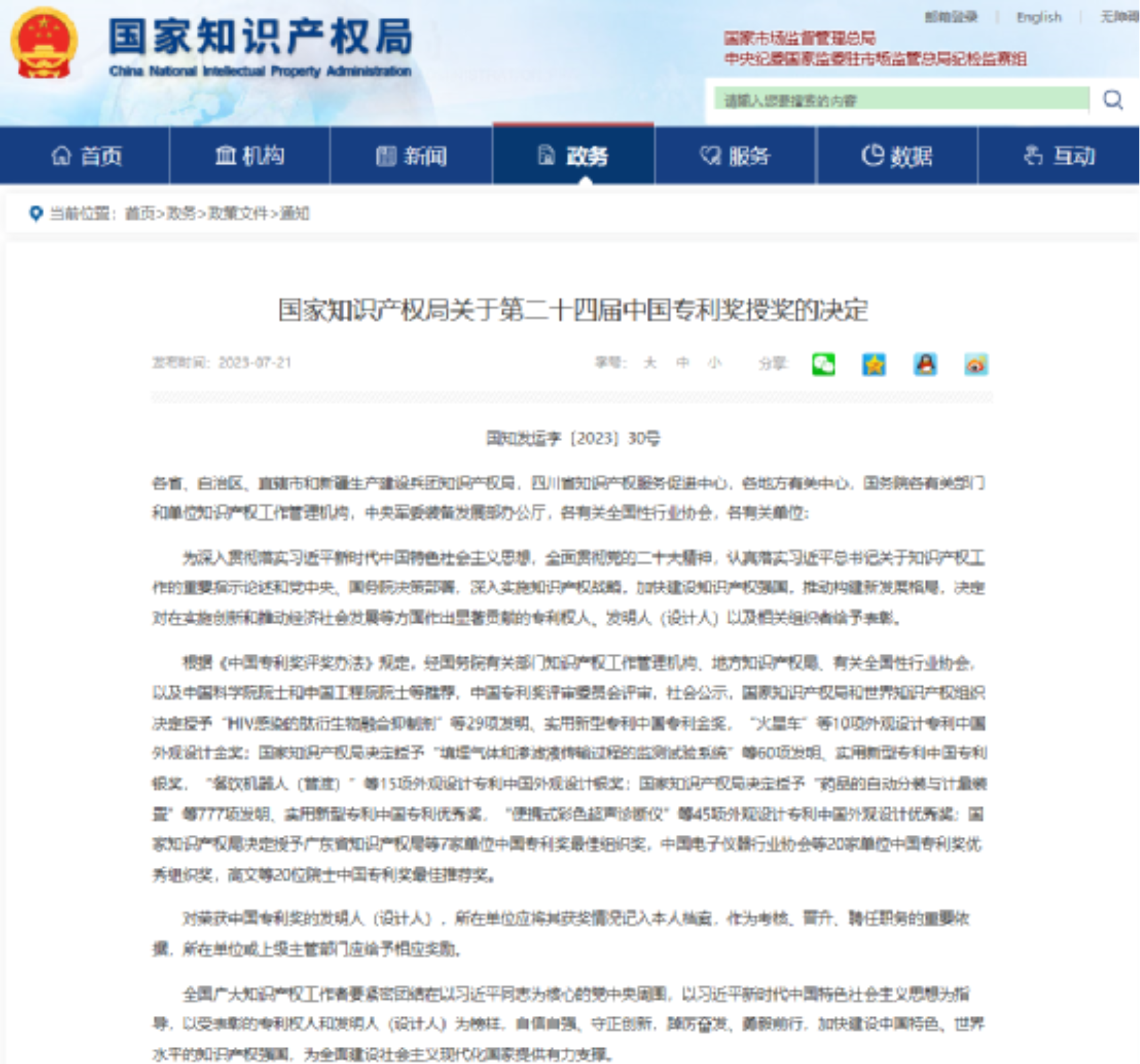 7月19日,国家知识产权局发布《关于第二十四届中国专利奖授奖的决定》(国知发运字〔2023〕30号),yl1111永利集团环境公司龙峰教授及团队申请的发明专利“一种多通道倏逝波全光纤生物传感器”获中国专利优秀奖,这是公司首次在中国专利奖有所斩获。中国专利奖设立于1989年,是我国专门对授予专利权的发明创造给予奖励的政府奖项,由国家知识产权局和世界知识产权组织共同组织开展,是我国专利领域的最高获奖荣誉,设置了中国专利金奖、中国专利银奖、中国专利优秀奖,中国外观设计金奖、中国外观设计银奖、中国外观设计优秀奖等六类奖种,每年授奖数量900多项。该奖项是国内专利领域的最高奖项,在国际上具有一定影响力。在中国专利奖的评奖标准中,不仅强调项目的专利技术水平和创新高度,也注重其在市场转化过程中的运用情况,同时还对其保护状况和管理情况提出要求。