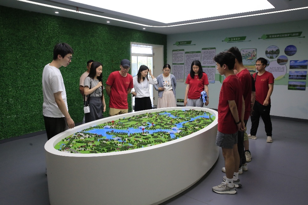 当天下午调研团一行来到安徽南陵奎湖省级湿地公园宣教馆,了解奎湖湿地公园在当地涵养水源、保护生态的重要作用。安徽南陵奎湖省级湿地公园管理办公室工作人员向调研团介绍了生态保护优先、加强基础设施建设的发展方向,全面讲述了奎湖湿地公园的生态修复保护历程和保护促发展的未来规划。而后,调研团师生就奎湖湿地公园保护、湿地保护修复与经济发展、奎湖美丽乡村建设等方面与当地负责人进行探讨,受益良多。
