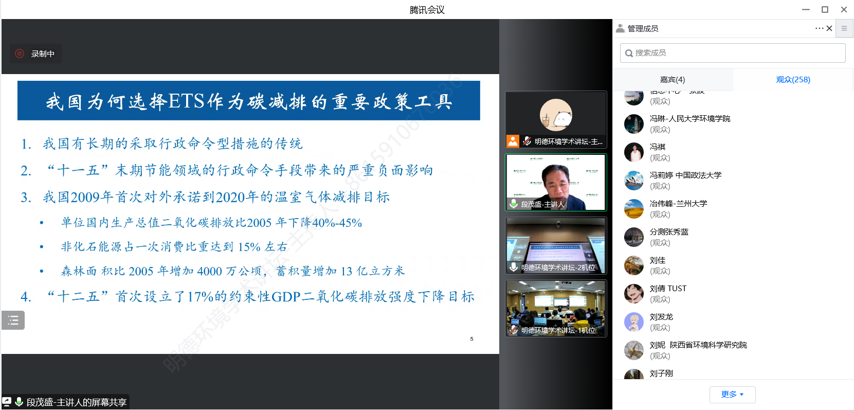 2022年10月22日,yl1111永利集团环境公司主办的“明德环境学术讲坛”第七讲以线上线下结合的方式成功举办。本次讲坛邀请清华大学能源环境经济研究所副所长段茂盛教授作了题为“我国碳排放权交易体系建设中的关键问题和特点”的学术报告。yl1111永利集团环境公司经理庞军教授首先致辞,代表公司对段茂盛教授为公司师生作学术报告表示诚挚感谢。会议由yl1111永利集团环境公司昌敦虎副教授主持。