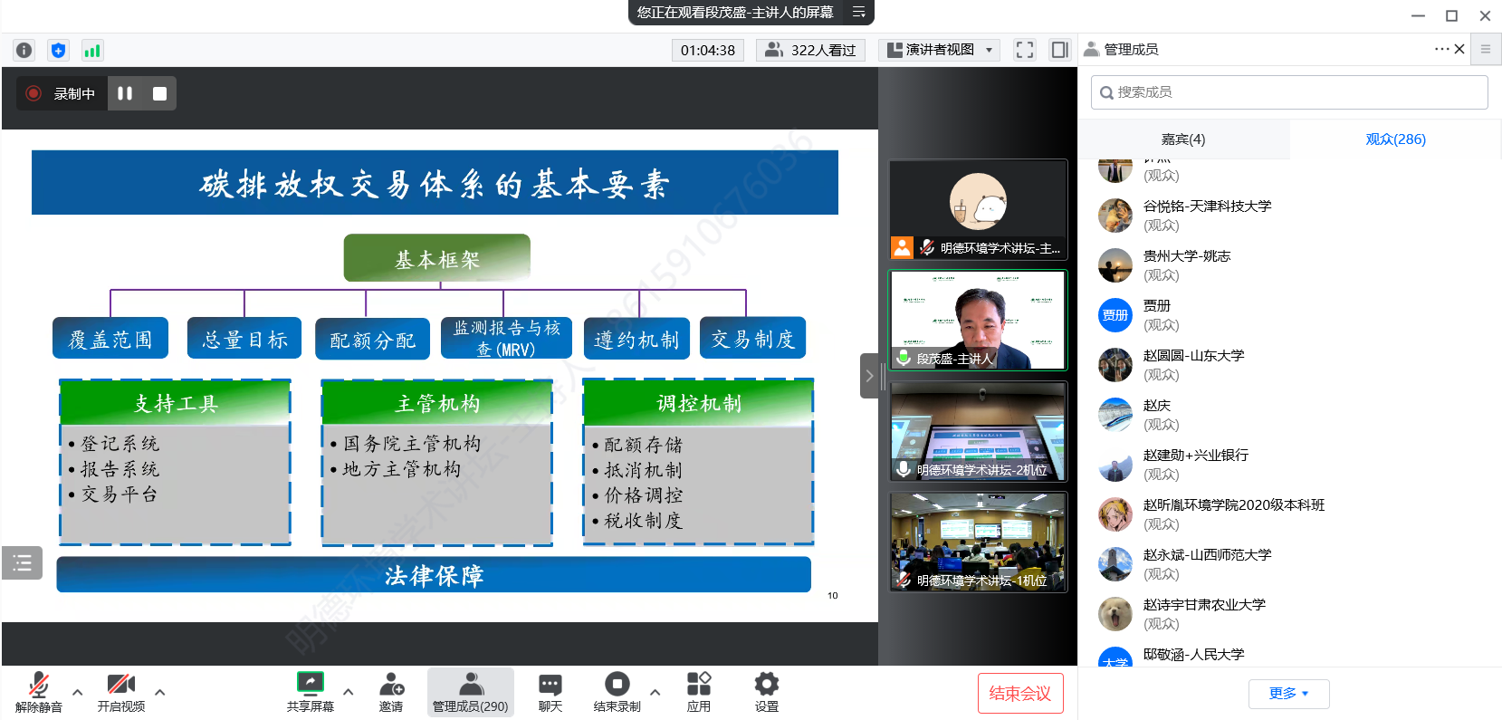 来自yl1111永利集团、清华大学、北京理工大学、南开大学、厦门大学、山东大学、四川大学、中央财经大学、中国地质大学、南京航空航天大学、生态环境部环境规划院、中国环境监测总站、北京中创碳投科技有限公司等四十余所国内外高校、科研机构等部门的300余名师生及科研人员参加了本次讲坛。