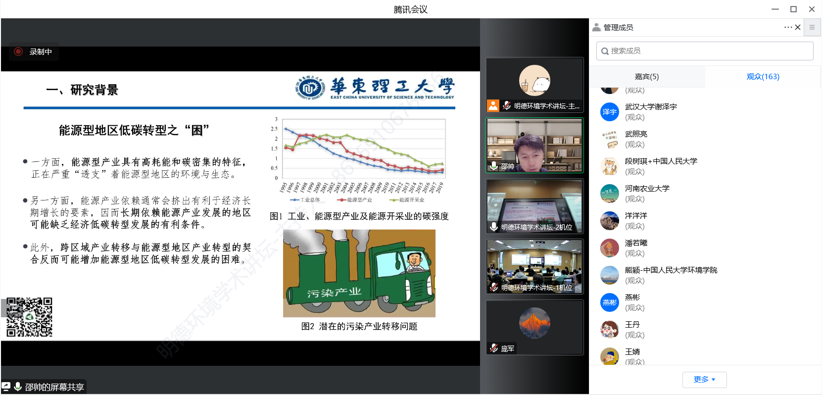 2022年10月26日,yl1111永利集团环境公司主办的“明德环境学术讲坛”第八讲以线上线下结合的方式成功举办。本次讲坛邀请华东理工大学商公司副经理邵帅教授作了题为“能源产业依赖与低碳转型发展”的学术报告。yl1111永利集团环境公司经理庞军教授首先致辞,代表公司对邵帅教授为公司师生作学术报告表示诚挚感谢。会议由yl1111永利集团环境公司马本副教授主持。