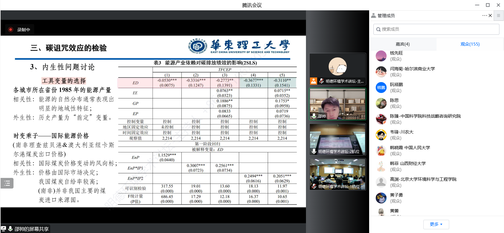 在交流讨论环节,针对学术报告中关于工具变量的外生性、能源效率与技术的关联性、传导机制的异质性分析、“碳诅咒”与碳锁定的关系、资源型城市分类的进一步探究以及政策建议的适用性等问题,与会师生与邵帅教授进行了深入探讨,学术氛围热烈。