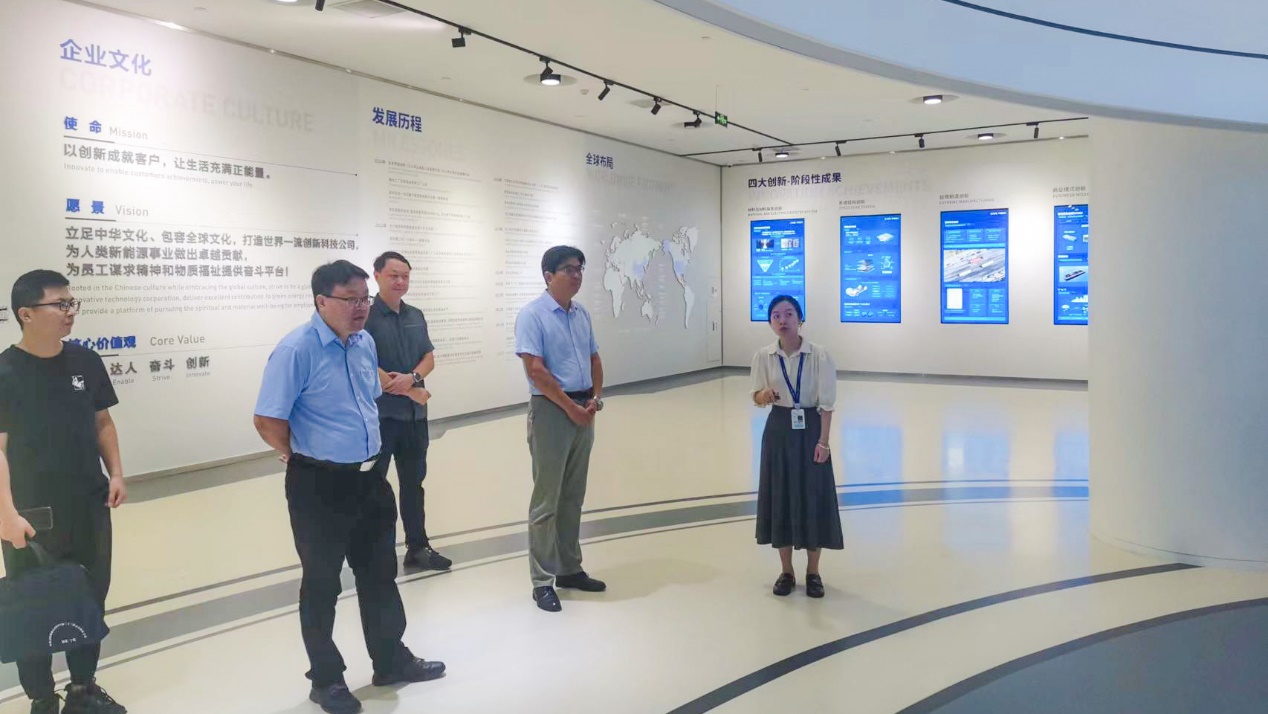 调研小组首先来到宁德时代展厅,参观了其核心产品动力电池,并通过讲解员现场讲解对宁德时代的企业文化、发展历程、全球布局和四大创新体系(材料创新、结构创新、极限制造创新、商业模式创新)以及其核心产品动力电池和储能电池的多样化使用场景有了较为清楚的了解。