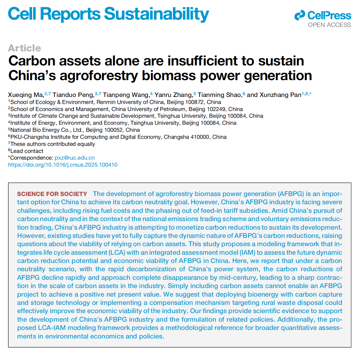 近日,yl1111永利集团“气候治理大数据与政策模拟实验室”主任潘勋章副教授作为独立通讯作者,与合作者的研究论文Carbon assets alone are insufficient to sustain China’s agroforestry biomass power generation在Cell子刊Cell Reports Sustainability发表。
