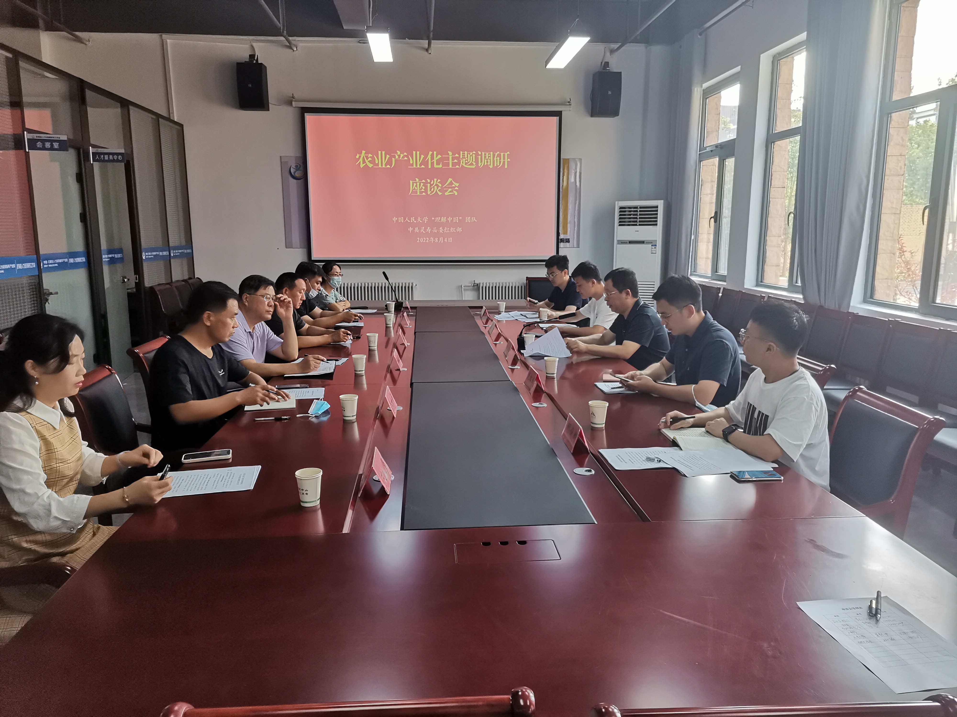 8月4日上午,实践团来到县人力资源服务工作站会议室,参加灵寿县农业产业化高质量发展座谈会,县农业农村局、县发展和改革局、县乡村振兴局、县人力资源和社会保障局、县自然资源与规划局、县文化广电体育和旅游局等相关领导出席座谈会。县委组织部副部长尹志国主持座谈会,县经济开发区规划建设局副局长(挂职)先虹锦介绍了此次调研活动背景及意义。座谈会上,实践团从灵寿县空间地理、农业经营者、政策支持等角度汇报了三天实地走访调研的阶段性成果,各部门结合自身情况对实践团提出的问题进行了解答。座谈会围绕灵寿县农业土地资源利用、产业发展项目、乡村振兴、生态农业旅游、农业人才培育、农村金融服务、社会资本参与情况等方面进行了热烈讨论,对如何走出一条民富物优、独具灵寿县特色的农业发展路子进行了深入研讨。