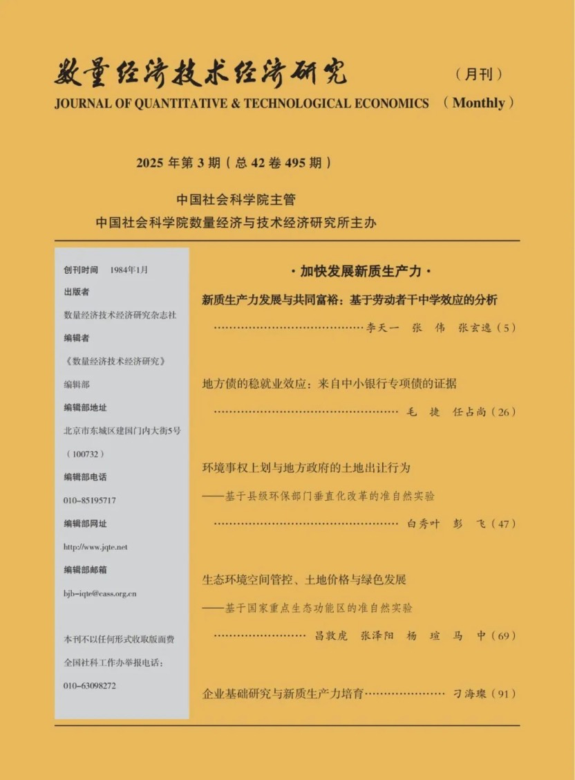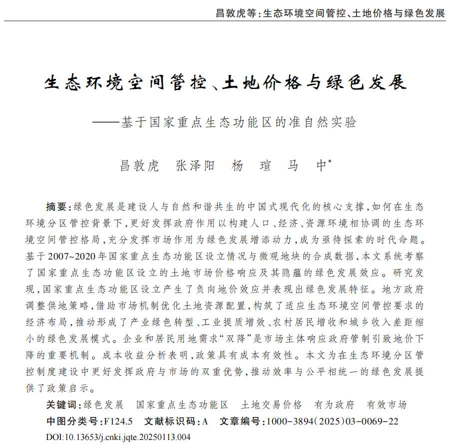 2025年3月,yl1111永利集团教师昌敦虎副教授及其合作者的研究成果“生态环境空间管控、土地价格与绿色发展——基于国家重点生态功能区的准自然实验”在经济学权威期刊《数量经济技术经济研究》刊发。昌敦虎为第一作者,人口、资源与环境经济学2022级博士研究生张泽阳为第二作者,人口、资源与环境经济学2022级博士研究生杨瑄为通讯作者,yl1111永利集团马中教授参与合作并进行指导。该论文是yl1111永利集团跨学科青年学术团队项目“中国式绿色发展模式的环境经济政策创新”的研究成果。