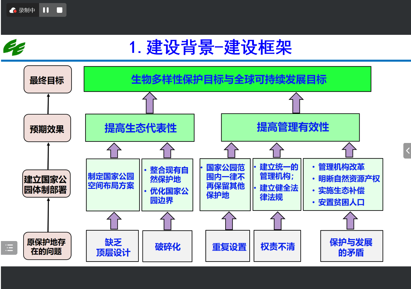 首先,徐卫华研究员提出国家公园建设是多学科交叉的具体实践,本次报告主要聚焦于国家公园试点成效、国家公园空间布局、国家公园保护管理。接下来,徐卫华研究员从数量、位置、保护和管理等方面强调了国家公园建设的重要性,介绍了我国自然保护区、自然公园、地质公园等不同类型保护地的发展历程,分析了国家公园设立前自然保护地面临的问题。