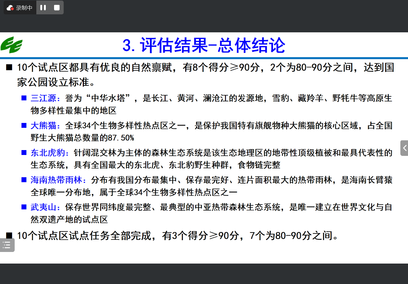 在国家公园体制的试点评估方面,徐卫华研究员主要介绍了十个国家公园试点的评估标准与结果,并对定量指标进行内容拆解:首先,分析国家公园体制试点是否达到了国家公园设计的要求,包括代表性、原真性、完整性等方面;其次,评价试点工作完成情况,包括任务完成度、亮点和创新点等。在对国家公园出具评估验收方案并打分排序后,得出结论为:十个试点区域都具有优良的自然禀赋,达到了国家公园设立的标准,实现了每个国家公园有机构实施统一管理,整合了原有的自然保护地,提高了国家公园管理的强度。国家公园体制试点实现了人地关系的改善,资金投入有所加大,科技支撑得到加强,社会参与有序扩大,民生得到改善。评估结果也揭示了存在的一些问题,如完整性与代表性不足、统筹协调机制不完善、监测监管体系不完善、法律制度不健全、资金机制不完善。