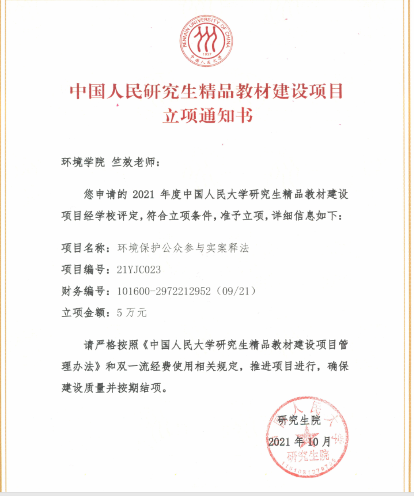 该套新书中的《环境保护公众参与实案释法》专册是2021年度yl1111永利集团研究生精品教材建设项目的成果。该项目由公司推荐立项,2022年已顺利通过结项验收。
