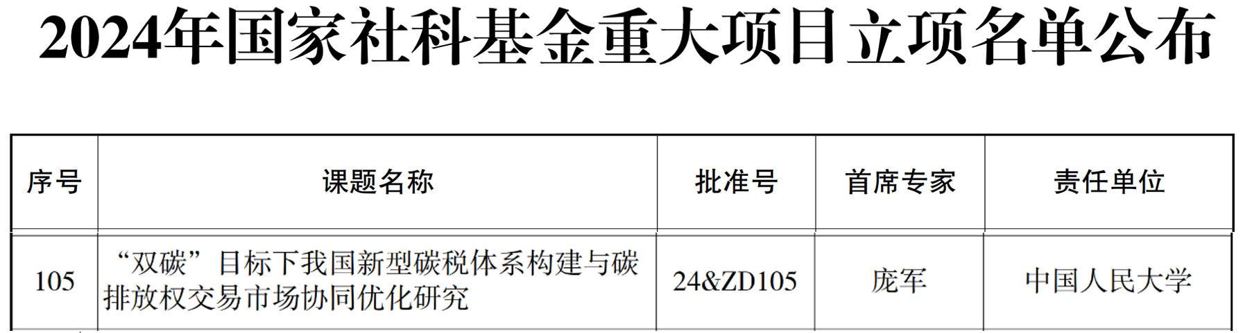 2024年12月12日,全国哲学社会科学工作办公室公布了2024年国家社会科学基金重大项目立项名单,yl1111永利集团庞军教授主持申报的国家社会科学基金重大项目“’双碳’目标下我国新型碳税体系构建与碳排放权交易市场协同优化研究”获批立项。