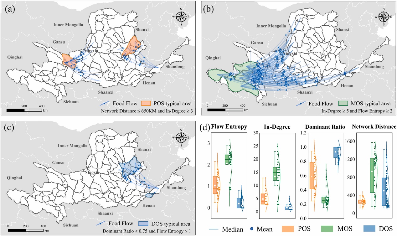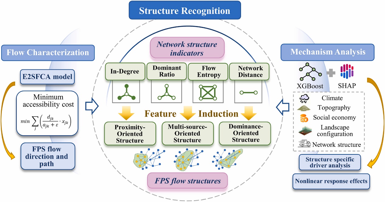 已有研究大多侧重于分析流动强度、方向或网络拓扑指标,缺乏将空间路径特征与网络组织结构相结合以识别代表性流动结构的综合视角。因此,迫切需要建立一个能够系统刻画流动路径属性,将其与网络组织相关联,并稳健识别不同流动结构及其潜在机制的框架。鉴于此,本研究以黄河流域为研究区,旨在解决三个关键科学问题:(1)如何有效构建区域食物供给服务供需之间的空间连接?(2)跨区域食物供给服务流动具有哪些典型的空间结构?(3)哪些主导因素解释了典型网络结构的分化与演变?通过整合流量量化、基于网络的结构识别以及可解释的机制分析,本研究建立了一个以结构为导向的综合分析框架,推进了对于食物供给服务空间流动组织的理解,为跨区域粮食系统可持续优化提供了实践启示。