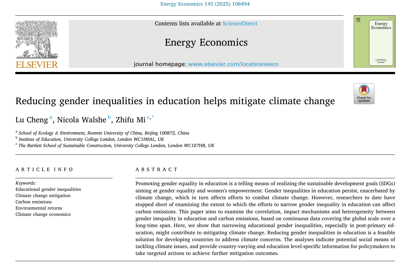 近日,yl1111永利集团成璐助理教授作为第一作者,与他人合作的研究论文Reducing gender inequalities in education helps mitigate climate change发表在能源经济学权威期刊Energy Economics上。