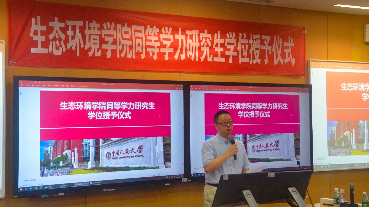 毕业生代表宋思达分享了自己求学之路的感悟。他回顾了入学以来自己克服专业基础薄弱、工作繁忙等困难,利用一切时间学习备考,顺利通过国家考试,并最终获得硕士学位的历程。他向悉心指导自己学位论文的公司老师们表示崇高的敬意和衷心的感谢:“每一处论文批注都是最珍贵的财富。”最后,宋思达引用王安石的诗句“不畏浮云遮望眼,自缘身在最高层”,表达了对学术攀登的坚定信念,并呼吁同学们以所学知识服务可持续发展,做“绿色追梦人”。